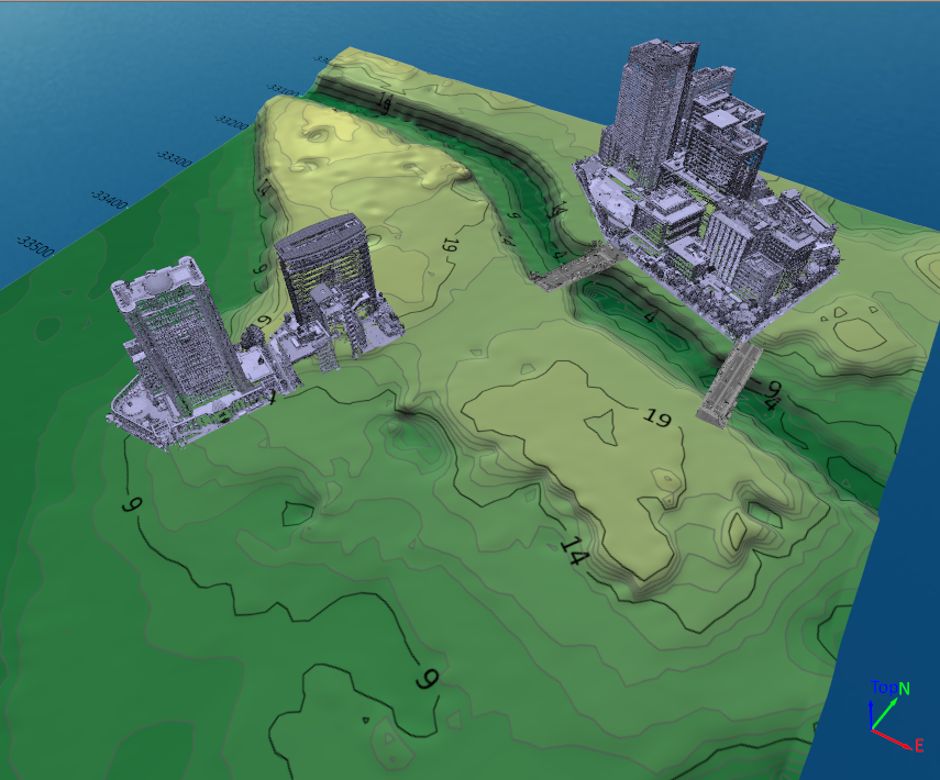 Surfer には異なる形式のデータ (画像、DEM, text, shp, DXF, …) を自由に重ね合わせ可能ですが、LiDAR データの一部を切り抜いて Surfer で作成した各種サーフェスモデルと組み合わせることも可能です。象徴的な建物を配置することで場所を示しているのかをわかりやすく伝えることができます。