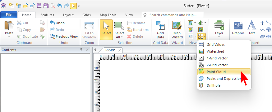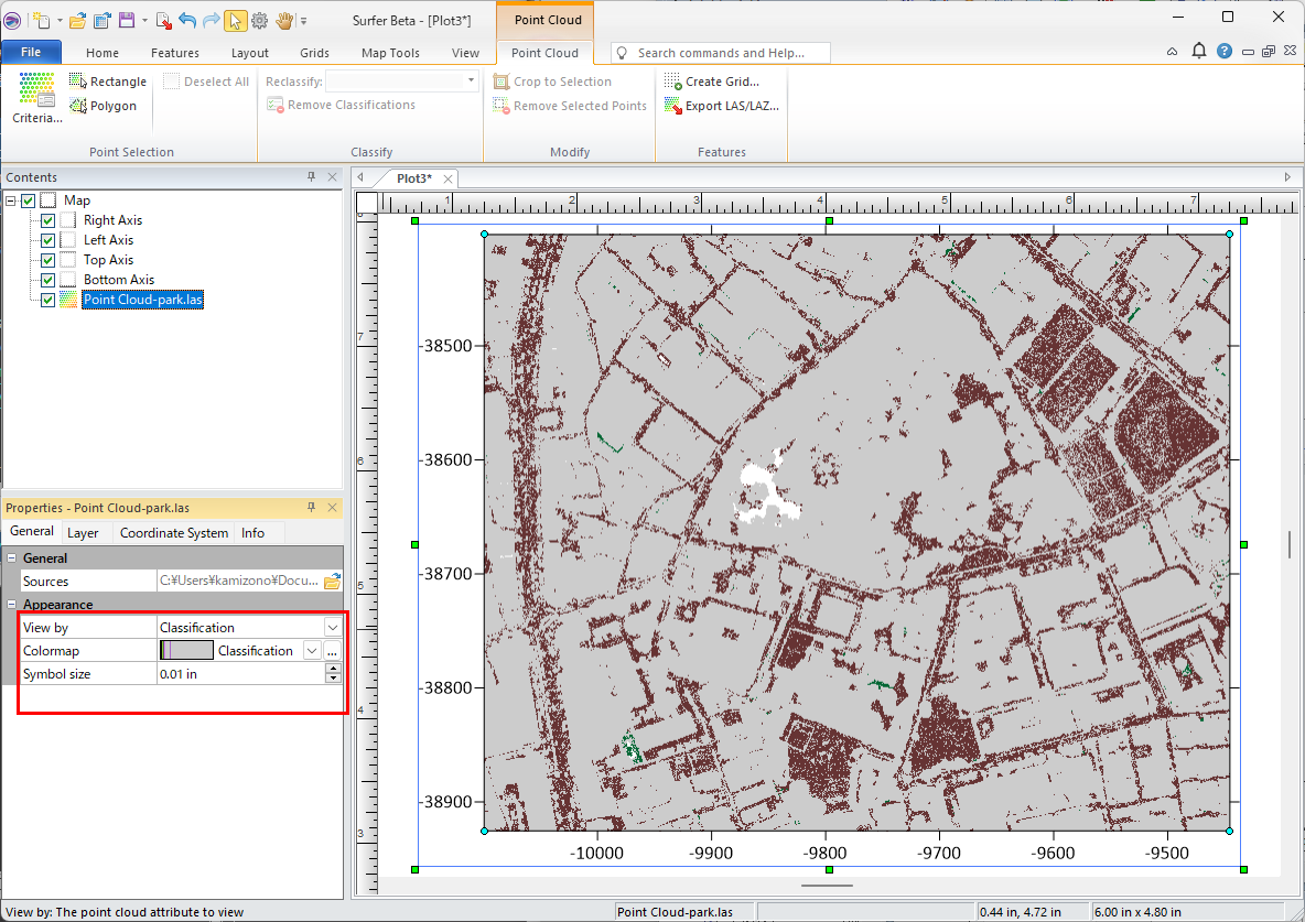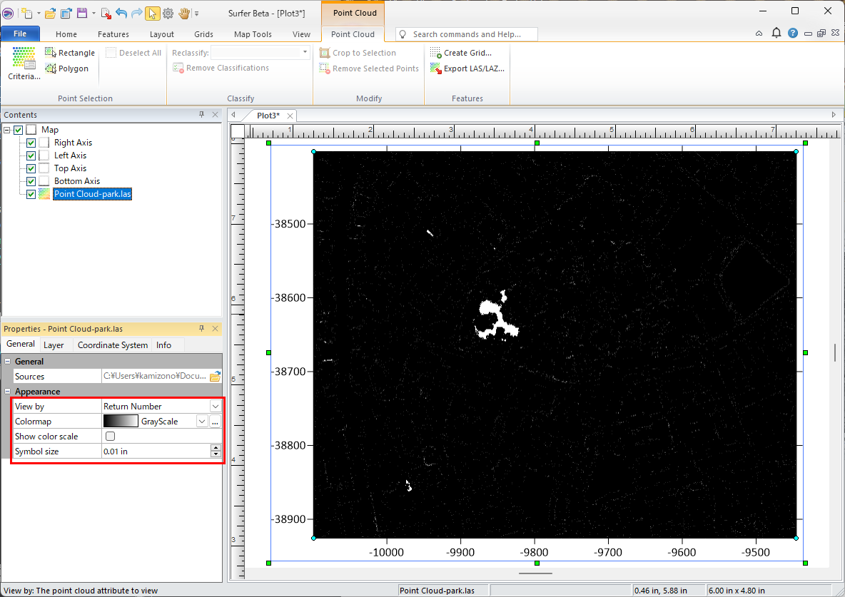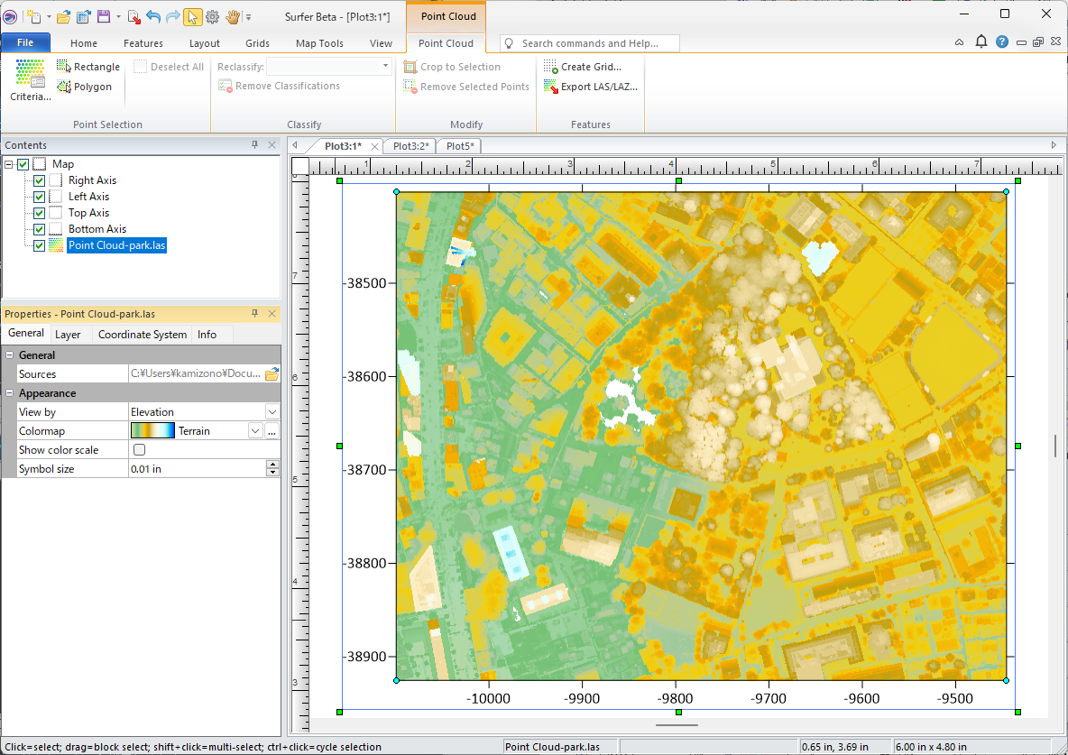 新しいプロットドキュメントを開き、取得した LAS ファイルをインポートします。リボンで Home をクリックし、New Map の Speciality の Point Cloud をクリックします。