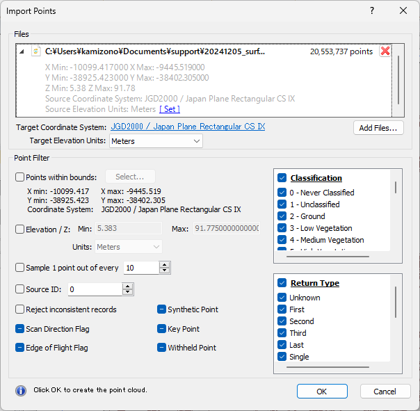 ここで Import Points ダイアログが表示されます。これは LiDAR データのフィルターコマンドセンターです。ダイアログの上部に、この LiDAR データセットのポイントの総数が表示されます。このデータセットには100万点以上のポイントがあることがわかります。