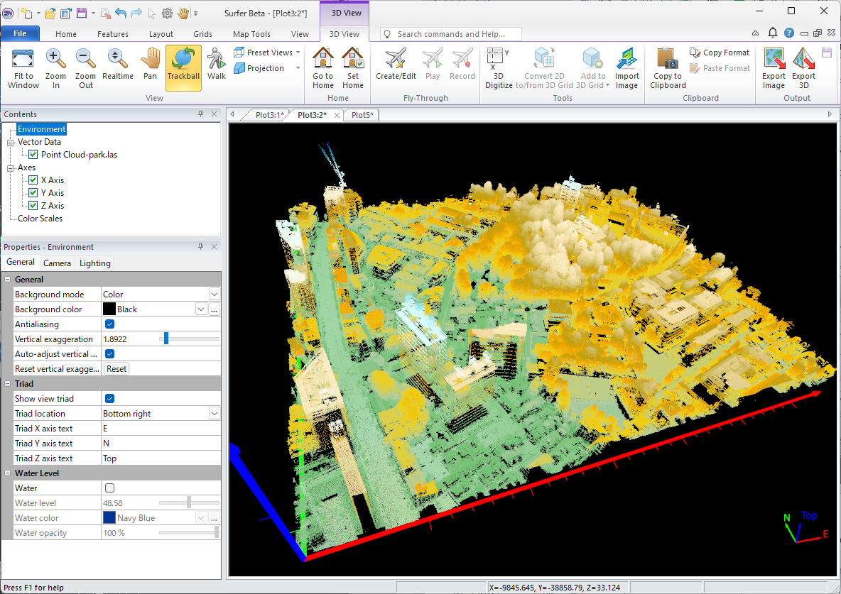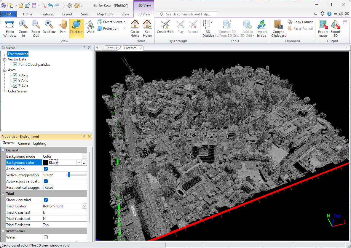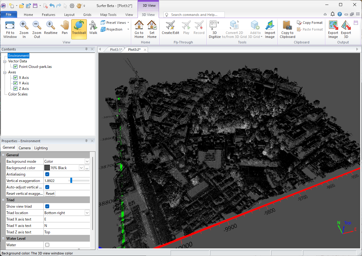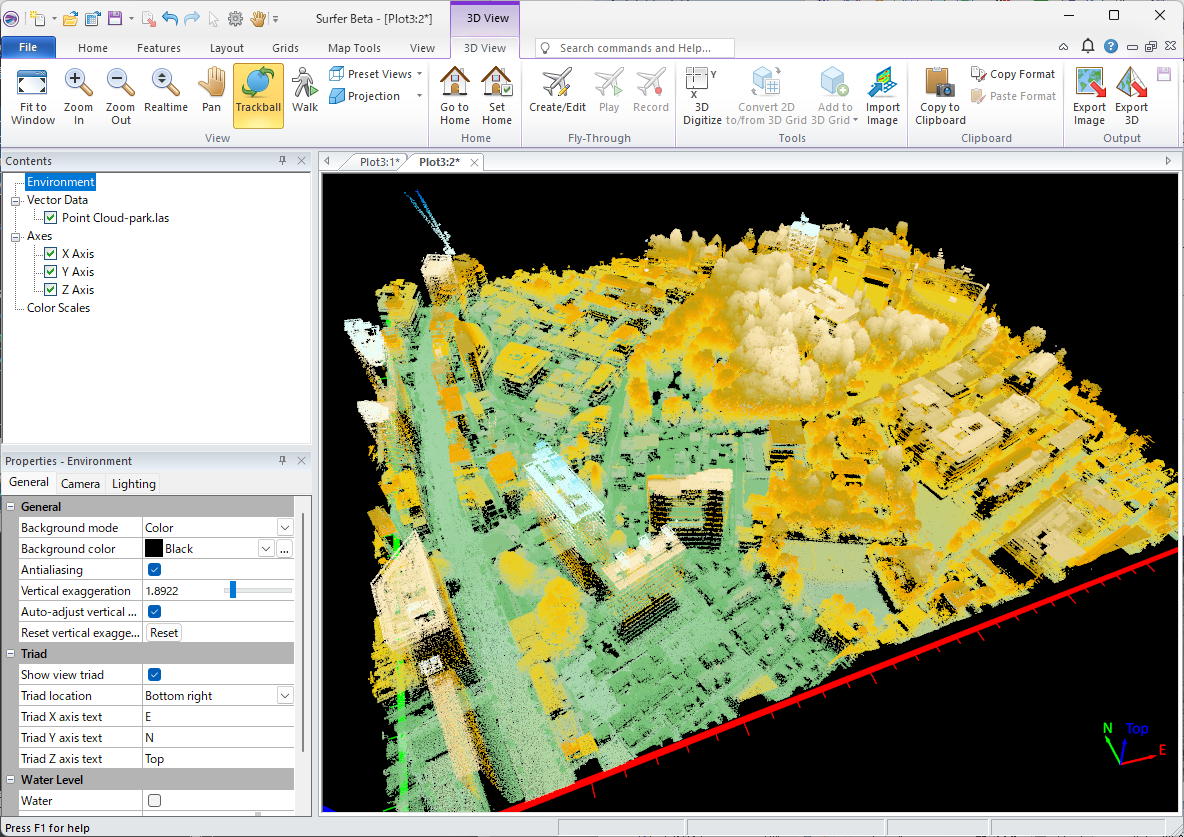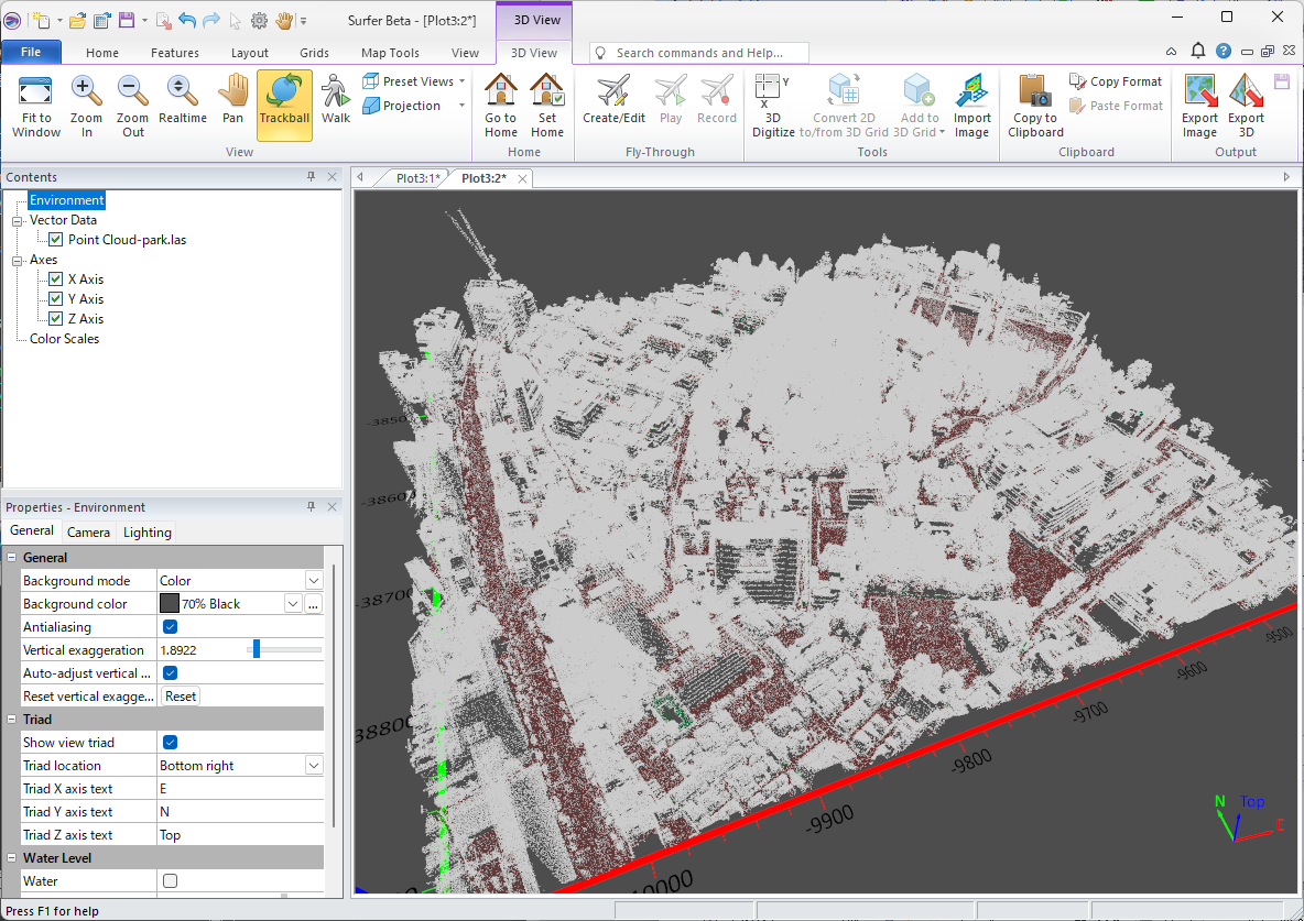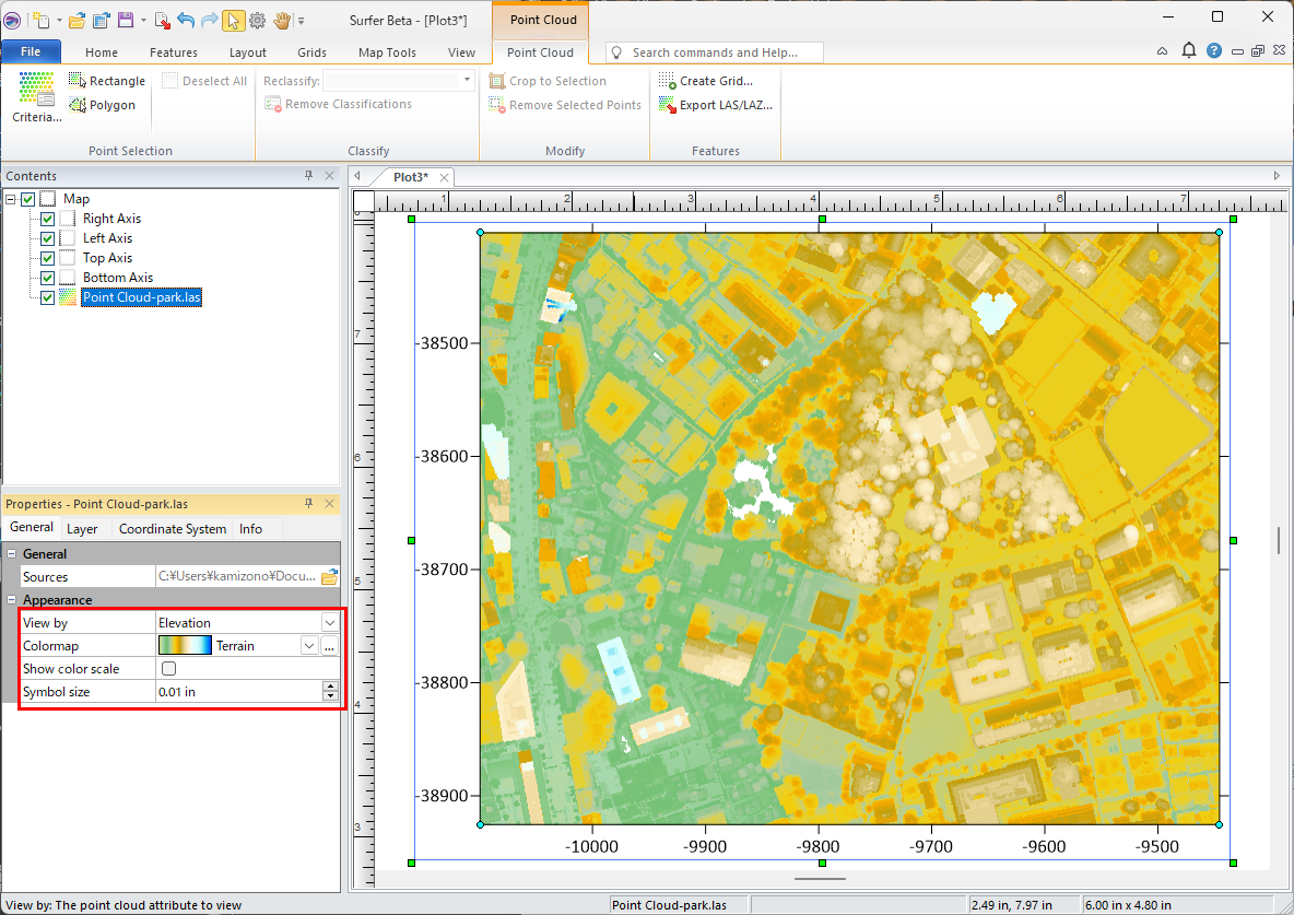 OK をクリックすると、Surfer にポイントクラウドレイヤーが作成されます。これは標高とデフォルトのカラーマップを使用してレンダリングされたものです。