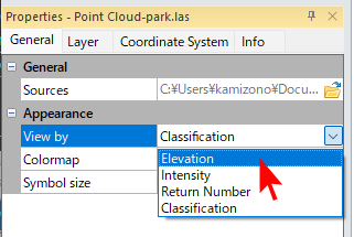 点群に含まれる標高値を使って色分けしたものです。デフォルトの表示方法はこれに設定されています。