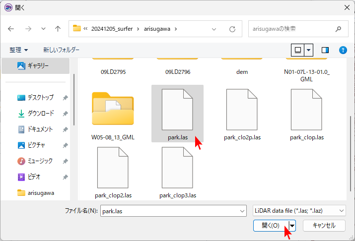 LASファイルの1つを選択し、「開く」をクリックします。