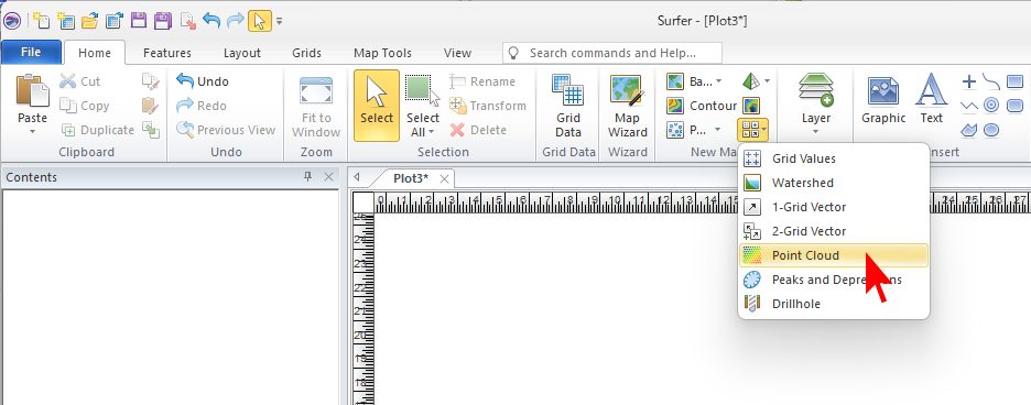 - Point Cloud マップを新規作成するとき:Home タブの New Map にある Point Cloud を選択すると Import Points ダイアログが表示されます。