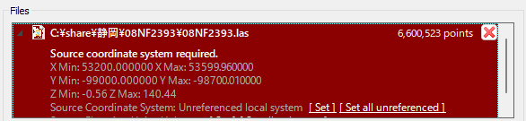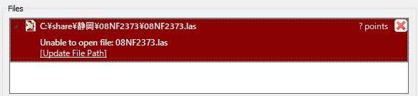 - また、SRF ファイルを開く際に、そこで使用されている単一又は複数の LAS データファイルが見つからなかった場合にも Import Points ダイアログが表示されます。データファイルが見つからなかった場合、 “Unable to open file <filename>”というエラーメッセージが赤で表示されます。この場合、Update File Path をクリックして見つからなかったファイルのパスを更新するか、X をクリックして Files リストからそのファイルを除外してください。