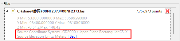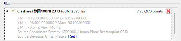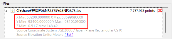 - ファイル名の下にソースデータの地理空間上の範囲が表示されます。この範囲として表示されるのは、X の最小・最大、Y の最小・最大、Z の最小・最大です。