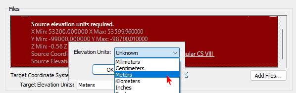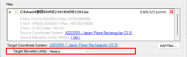 - データ ファイルに標高単位情報が含まれていれば、自動的にソース標高単位が設定されます。ソース標高単位が設定されていない場合は、[Set] をクリックしてそのデータのソース標高単位を指定します。
