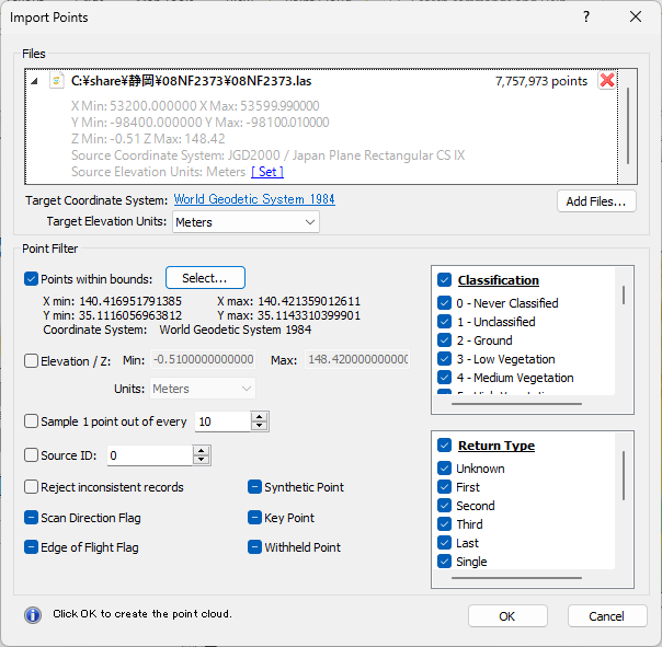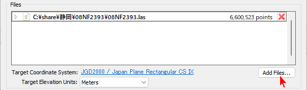 LAS/LAZ ファイルの取り込みには、Import Points ダイアログを使います。このダイアログを使うことで、入力する LAS データの追加や削除、座標系の設定、取り込むデータの各種フィルタリングを行うことができます。