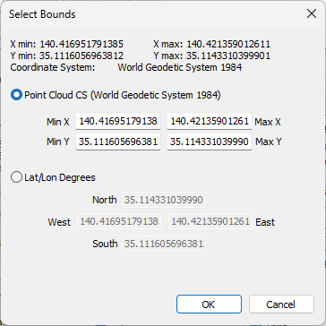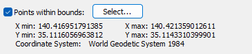 - Points within bounds フィルターは、インポートする点群をここで指定する XY の範囲に制限します。Points within bounds フィルターを適用するには、Points within bounds チェック ボックスをオンにします。Select をクリックして表示される Select Bounds ダイアログで境界を設定します。Points within bounds の下に、XY の最小値と最大値、および、それらの座標系が表示されます。