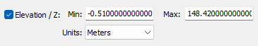 - Elevation / Z filter フィルターは、インポートする点群をここで指定する標高または Z 値の範囲に制限します。Elevation / Z フィルターを適用するには、Elevation / Z チェック ボックスをオンにします。Min フィールドにはインポートする Z の最小値を指定します。Max フィールドにはインポートする Z の最大値を指定します。