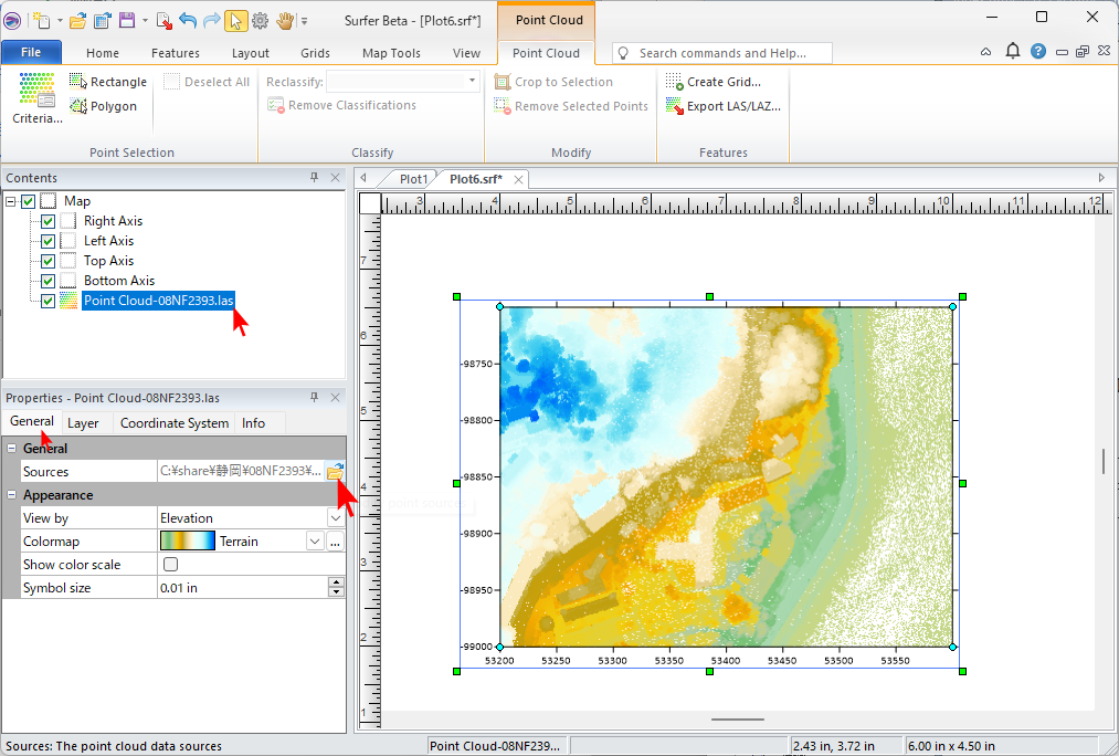 - 既存の Point Cloud マップのソースデータを変更するとき:Point Cloud マップを選択して、Properties ウィンドウの General タブにある Sources のリンクボタンをクリックします。