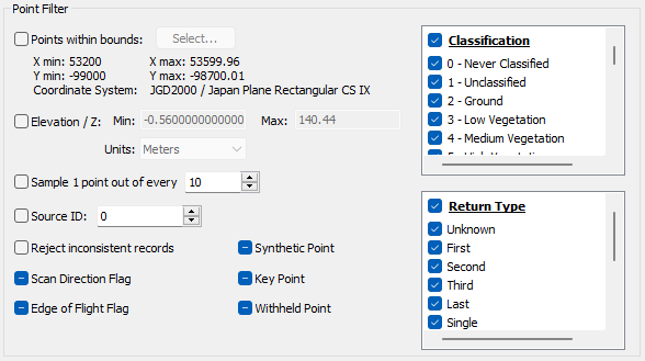 入力ファイルの点群は、Point Filter セクションの各種条件でフィルターをかけることができます。