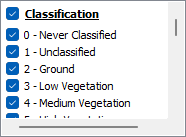 - Classification フィルターは、インポートする点群を選択したクラスのみに制限するものです。すべてのクラスをインポートするには、Classification チェック ボックスをオンにします。すべてのクラスをクリアするには、Classification チェック ボックスをオフにします。目的のクラスの横にあるチェック ボックスをオンにすれば、インポートするクラスを個別に選択できます。