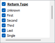 リターン値のすべてのタイプをインポートするには、Return type チェック ボックスをオンにします。すべてのリターン値のタイプをクリアするには、Return type チェック ボックスをオフにします。目的のリターン値のタイプの隣にあるチェック ボックスをオンにして、インポートするリターン値のタイプを個別に選択できます。