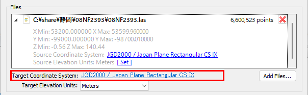 - すべてのファイルのソース座標系は、このターゲット座標系に変換されます。Point cloud レイヤーを作成すると、このターゲット座標系が Point cloud レイヤーのソース座標系になります。