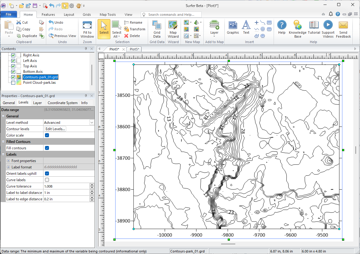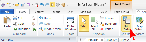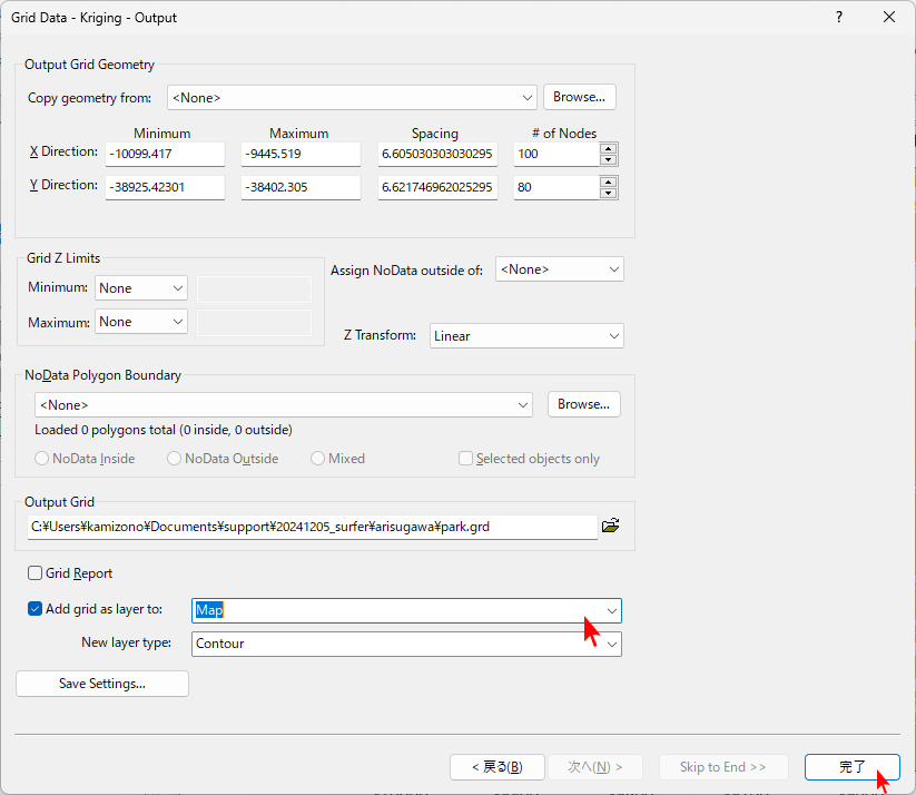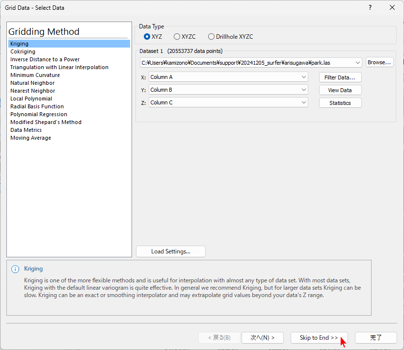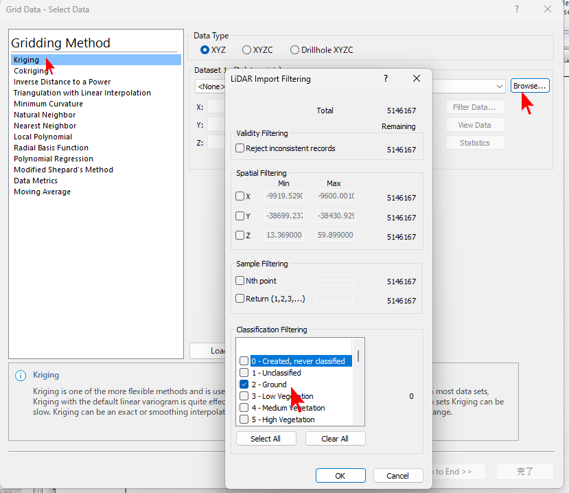 Grid Data ダイアログから、補間法に Kriging を、Data Type には XYZ を指定し、保存したデータを Browse で開きます。LiDAR Import Filtering ダイアログが表示されますので、Classification Filtering で Ground を指定します。
