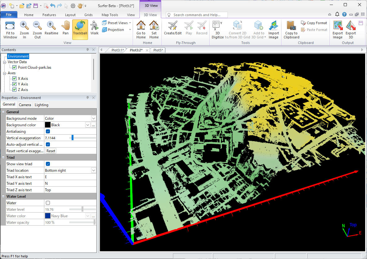 3D View で表示します。地形以外の点群は除外されているのが分かります。Point size を小さ目に指定しています。
