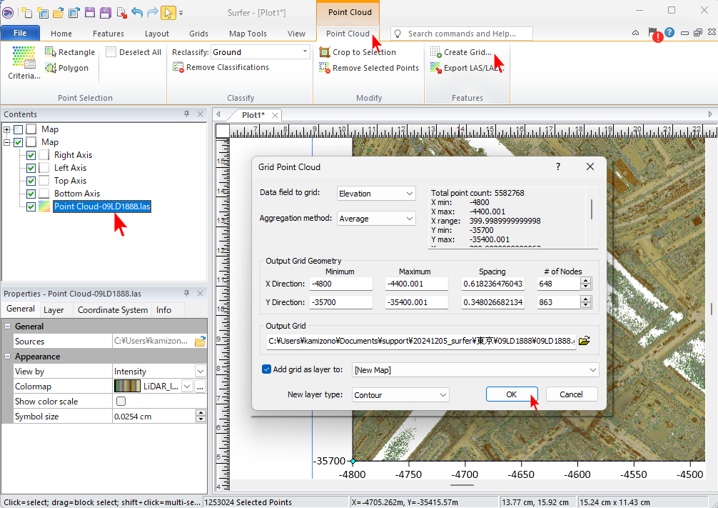 次のステップは、LiDAR データセットから Point Cloud レイヤーを作成し、その Point Cloud レイヤーからグリッドを作成することです。この方法を使用すると、大規模なデータセットであっても、ほぼ即座にグリッドを作成できます。従来のグリッド手法では、このような即座に結果を得るのは困難です。