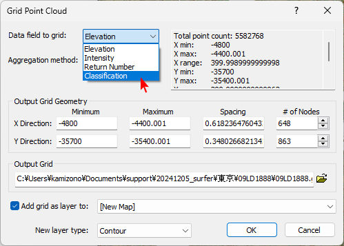 グリッドパラメータを調整するときに考慮すべき主な要素は2つあります。グリッド化するデータフィールド (Data field to grid) とグリッドの解像度です。最初の要素は単純です。Point Cloud レイヤーからグリッド化する対象を決定するだけです。elevation (標高) データ、intensity (強度)、classification (分類)、return number (リターン値) を選択できます。