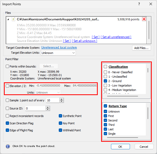 数百万のポイントを扱う場合、ストーリーに最もふさわしいデータに焦点をしぼることは大事です。そこで、インポート フィルターが役立ちます。最初のステップは、インポート時に LiDAR データをフィルターして、最も重要な調査データのみをグリッド化で考慮するようにすることです。