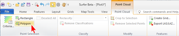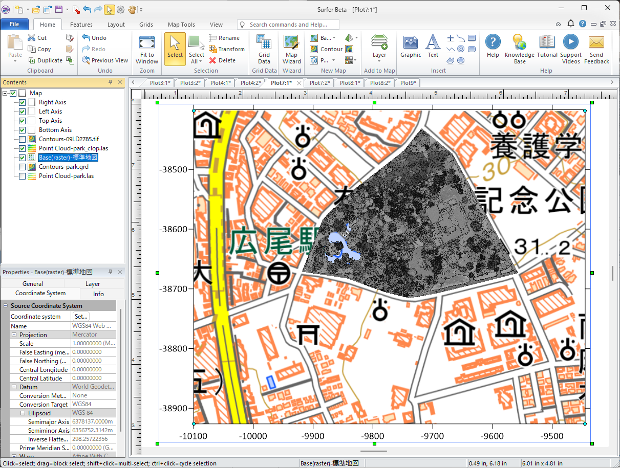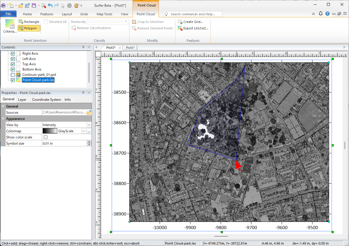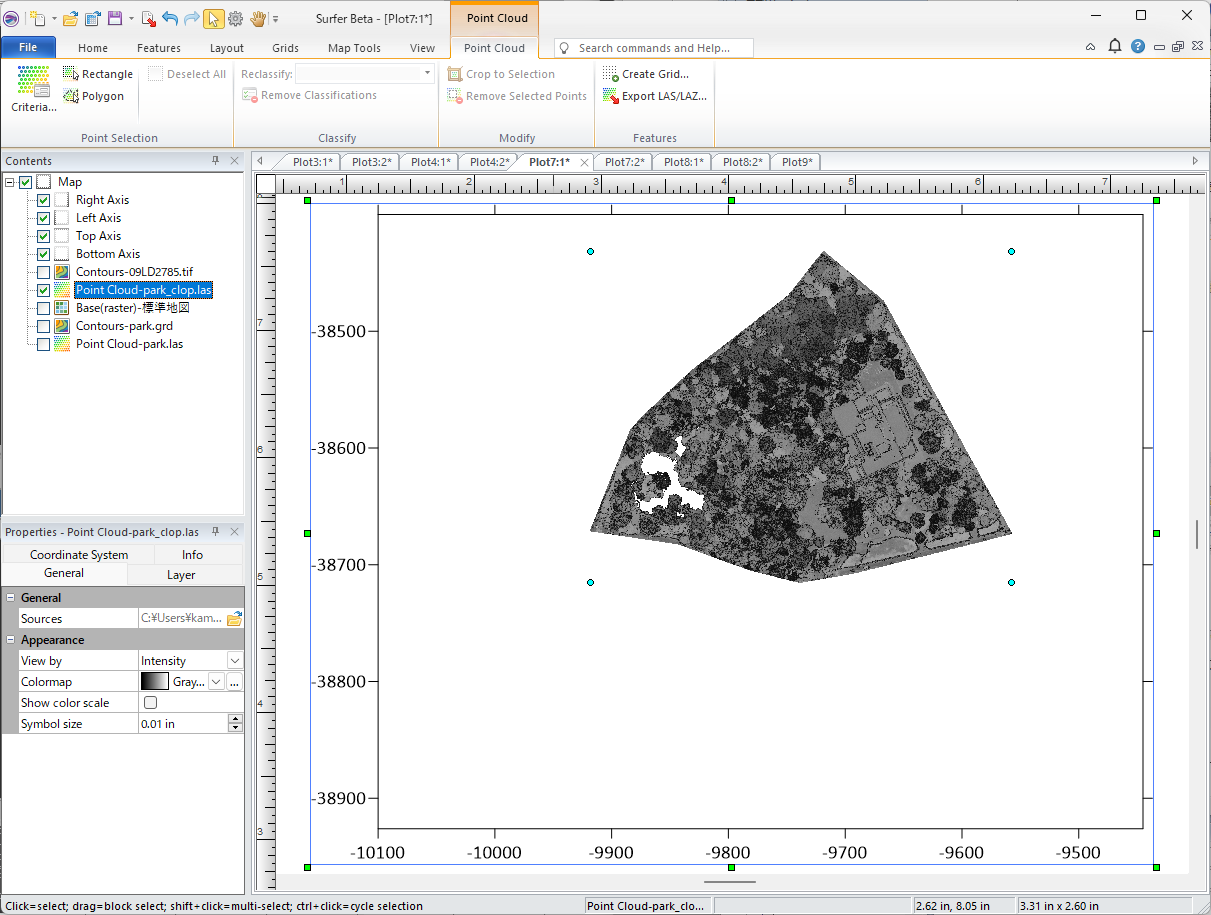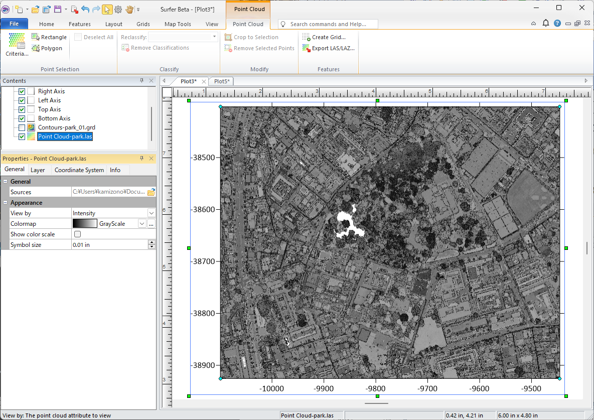 LiDAR データの一部を切り抜いて、フィーチャー (地物) として利用すれば、Surfer の多彩なマップ表示機能と組み合わせて利用することができます。