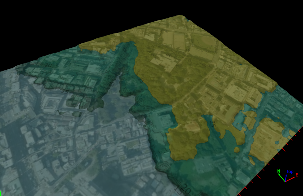 別のレイヤーにマップを用意します(地表面をあらわす等高線と航空写真を重ね合わせた例)。グリーンの切れ込み部分は有栖川公園の渓谷です。
