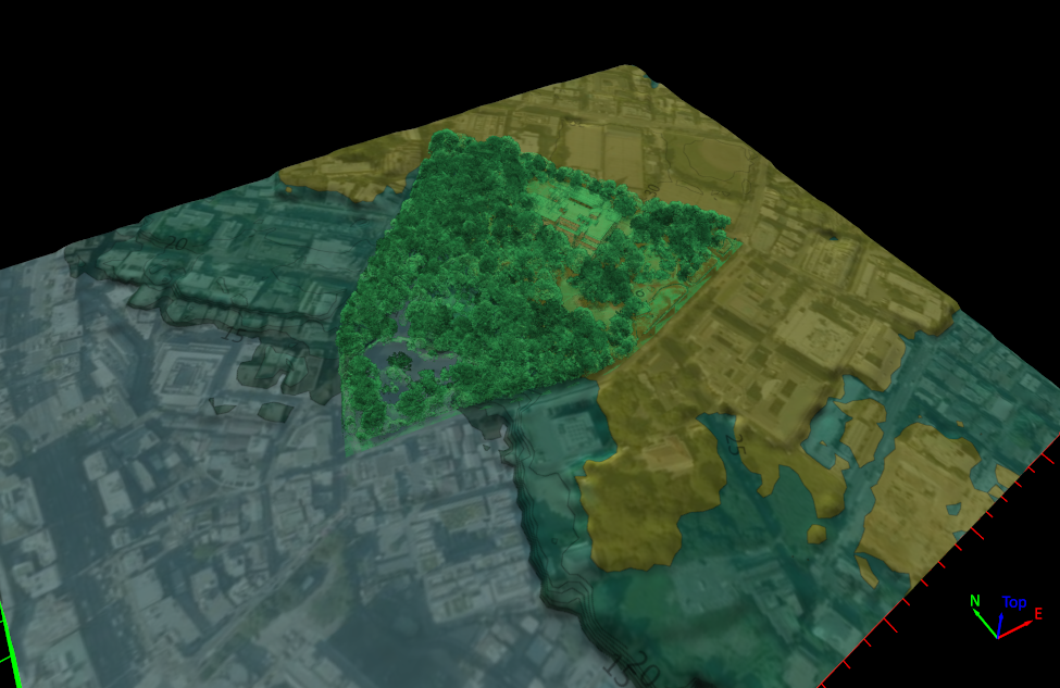 このマップに Point Cloud レイヤーを重ね合わせます。渓谷は公園の森にすっぽりと覆われます。