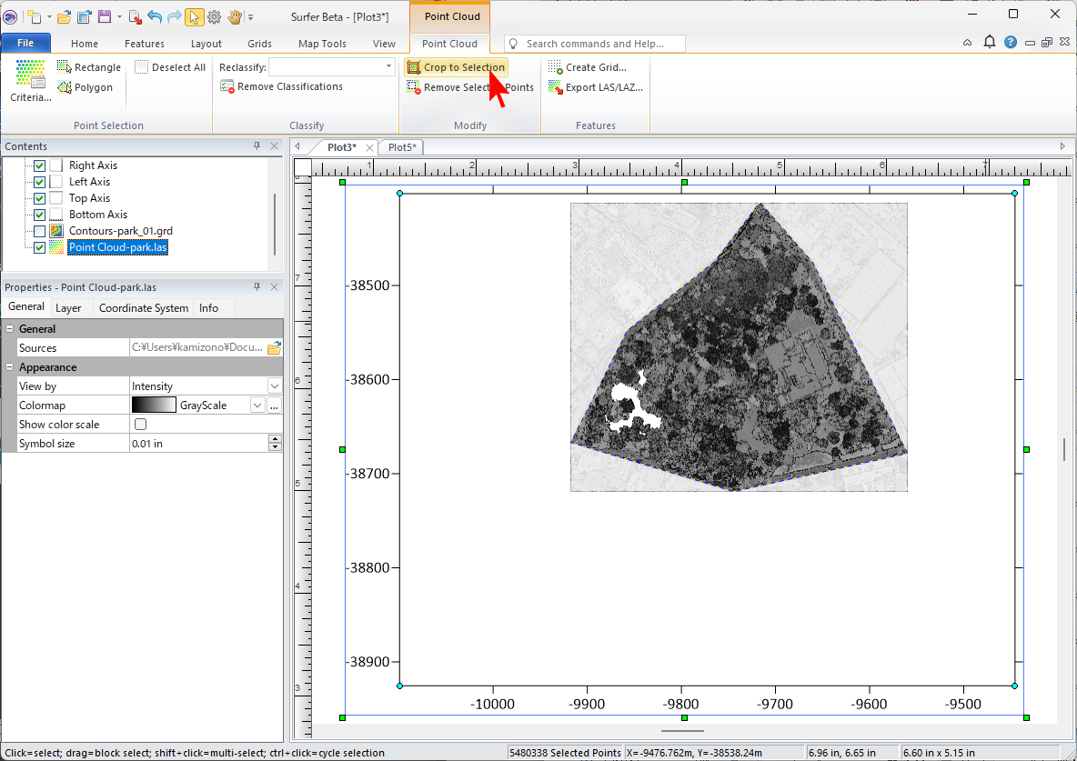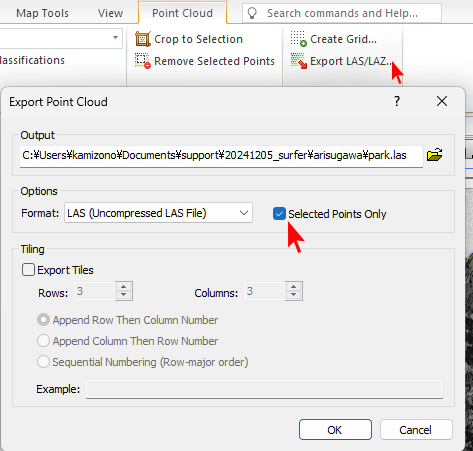 Export LAS/LAZ ボタンをクリックして、この範囲のデータを保存します。Selected Points Only オプションにチェックを入れることで、選択した範囲のみのデータが出力されます。