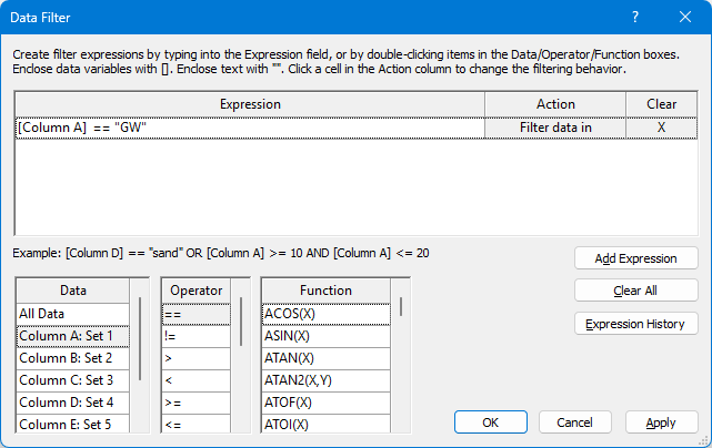 特定の井戸をターゲットにするには、Data Filter ウィンドウに式 (expression) フィルターを入力する必要があります(例: [Column A] == “MW-3A (deep)”)。このフィルターを Object Manager にリストされている各データ駆動型プロットに適用することで、プロットウィンドウ内のすべてのプロットが目的とする well/hole ID に更新されます。