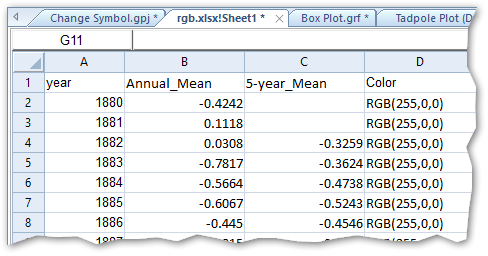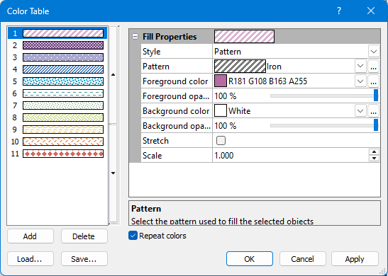 Color Table (For Standardized Patterns) を使用する。カラー テーブルは、作成した柱状図の塗りつぶしパターンとカラーの両方を手動で定義できる組み込み機能です。