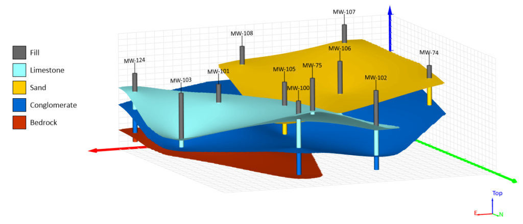 このプロセスでは、井戸の位置と層状データをインポートすることで、3D モデルの基礎を作成します。その後、Surfer の新しい「Create Contacts(接触点の作成)」機能を使用して、岩相レイヤー間の境界を表す 3D サーフェスを自動的に補間・生成します。