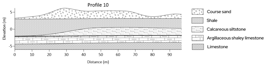 Surfer は Strater と全く同じプロファイル(cross-section)を作成することはできませんが、作成した 3D サーフェスに基づいて、土壌層の非常に正確な可視化表現を提供できます。その後、Profile コマンドを使用して、カスタム定義したラインに沿ってデータを素早くスライスできます。