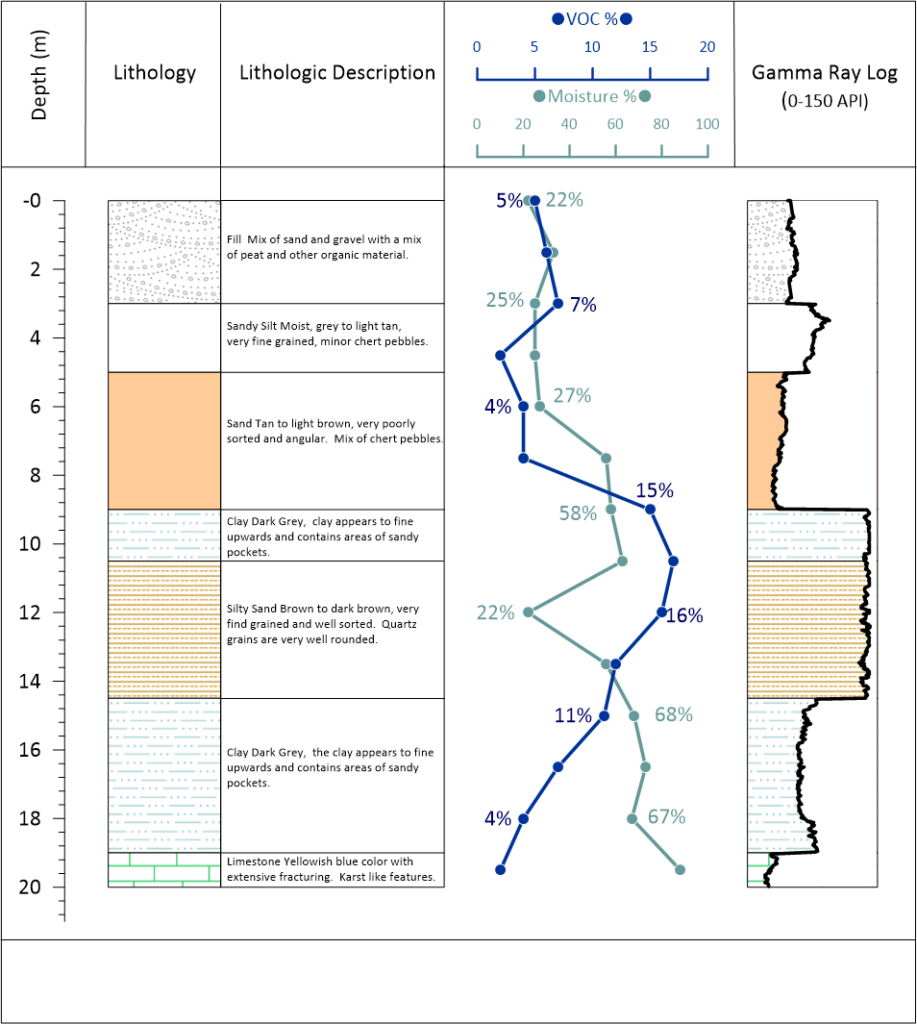 環境分野に必須のボーリング孔ログをあらわします。岩相、土壌層の説明、分析測定、ガンマ線地球物理学的ログをすべて深度別に統合します。