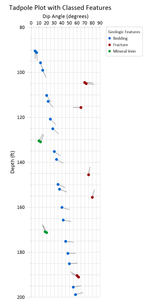 タッドポール (オチャマジャクシ) プロットを使用して、地層、割れ目、鉱脈などの平面的な地質学的特徴の方向を可視化します。円形のマーカーは傾斜角を、尾は傾斜方位をあらわします。