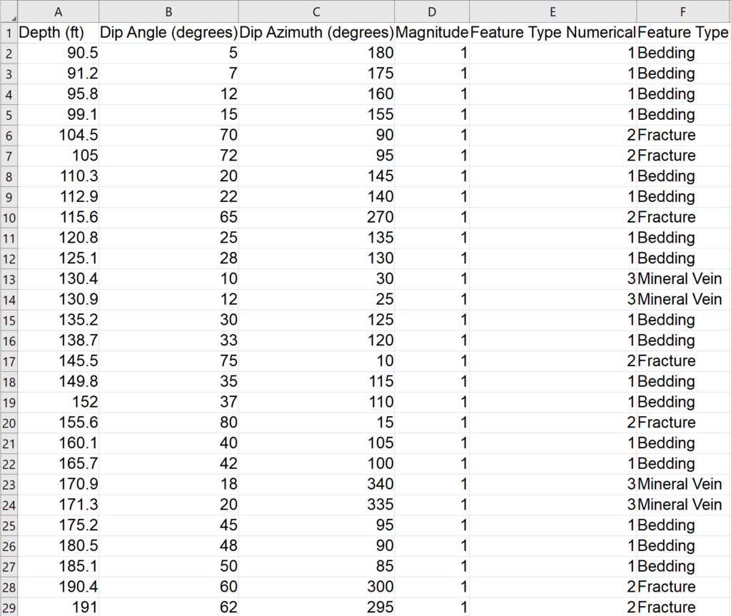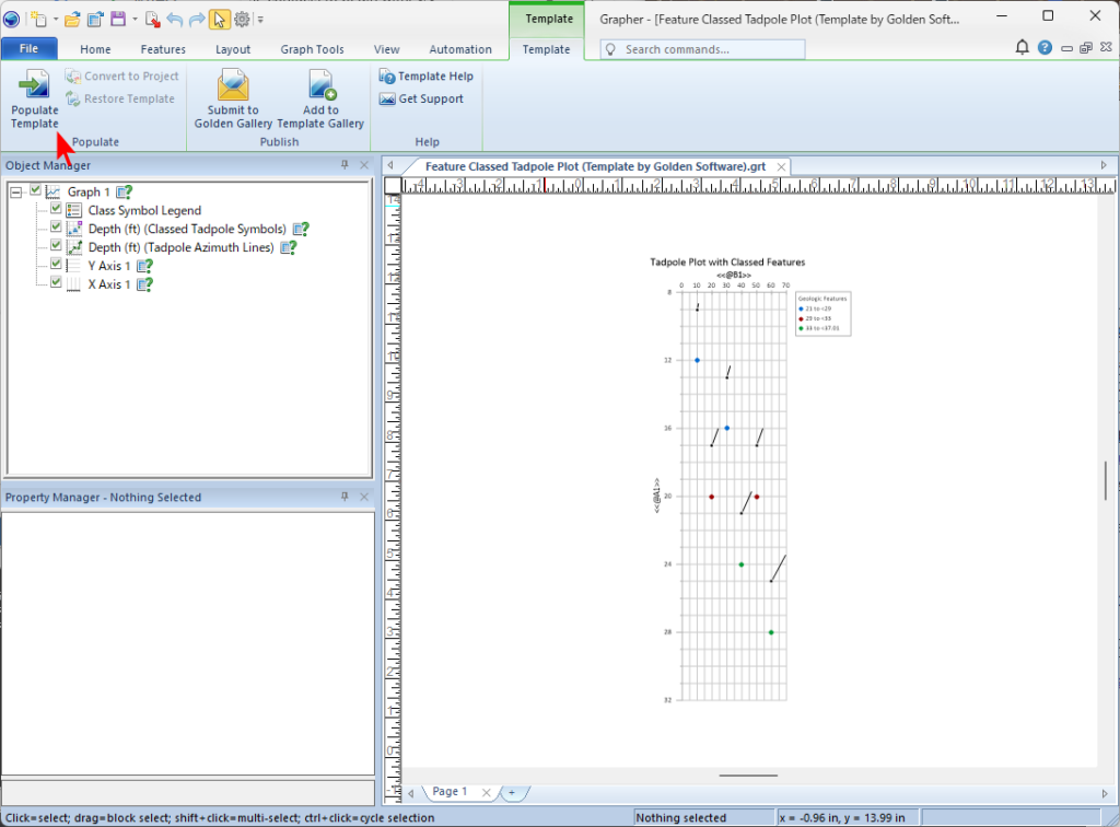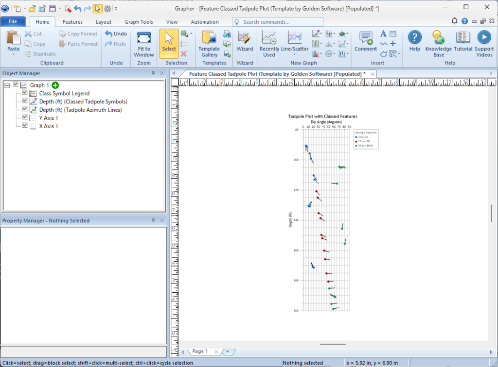 タッドポールプロットは、構造地質学 (structural geology)、地質工学検層 (geotechnical logging)、鉱業 (mining)、水文地質学 (hydrogeology) において、断裂群 (fracture sets)、地層傾向 (bedding trends)、鉱化帯 (mineralized zones) の特定に広く用いられています。Magnitude 列はオタマジャクシ (tadpole) の尾の長さを制御し、各傾斜方位線のスケールを定義します。すべての特徴クラス、シンボル、ラベルは、Object Manager で簡単にカスタマイズまたは切り替えることが可能で、特定のデータセットやレポートに合わせて図を調整できます。