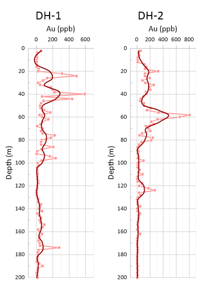 このプロットタイプは、複数のドリルホールにおける地球化学的な坑井プロファイルを示します。サンプリングされた値は深度に沿った点としてプロットされ、全体的な濃度パターンを強調するために、平滑化された傾向線が重ねて表示されます。このプロットは、ドリルホール間の品位のばらつきを視覚的に明確に比較するのに役立ちます。