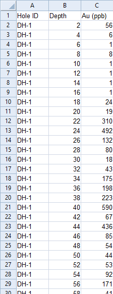 このテンプレートで使用するサンプルデータは以下にあります。ダウンロードして、独自のデータを使用して調整できます。Drillhole-Logs.xlsx