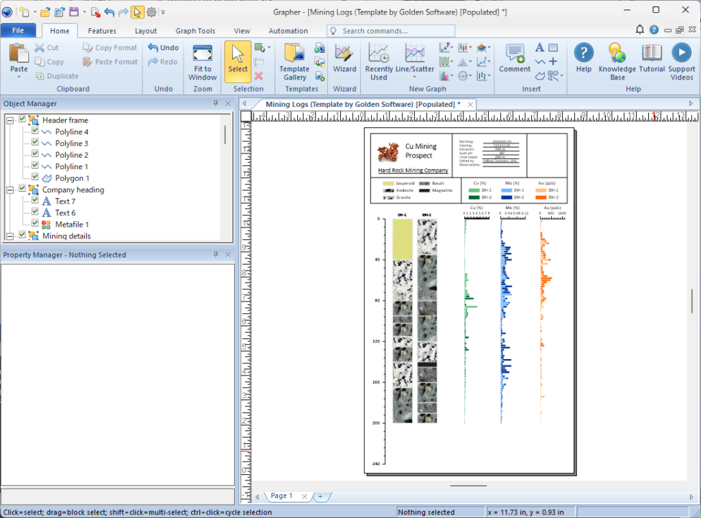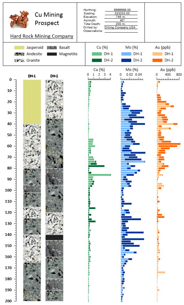 銅 (copper)、ミューオニウム (muonium)、金 (gold) など、複数のドリルホールから収集された情報を表示することで、地下の地質と元素資源を分かりやすくグラフ表示するテンプレートです。一般的な企業レポート用のフレームレイアウトが含まれています。