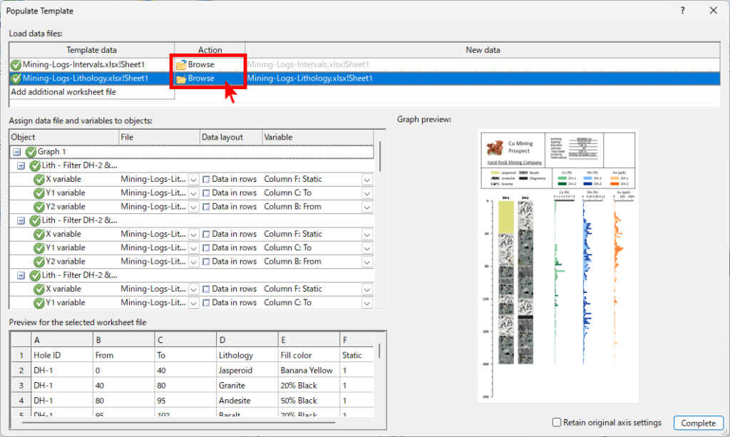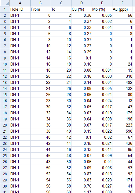 このテンプレートで使用するサンプルデータは以下の 2 つのファイルです。ダウンロードして独自のデータを使用して調整できます。Mining-Logs-Intervals.xlsx / Mining-Logs-Lithology.xlsx