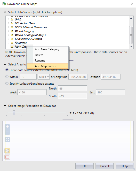 Home タブの Base ボタンの中にある Base from Server ボタンをクリックして、Download Online Maps ダイアログが表示されたら、右クリックして Add Map Source をクリックします。