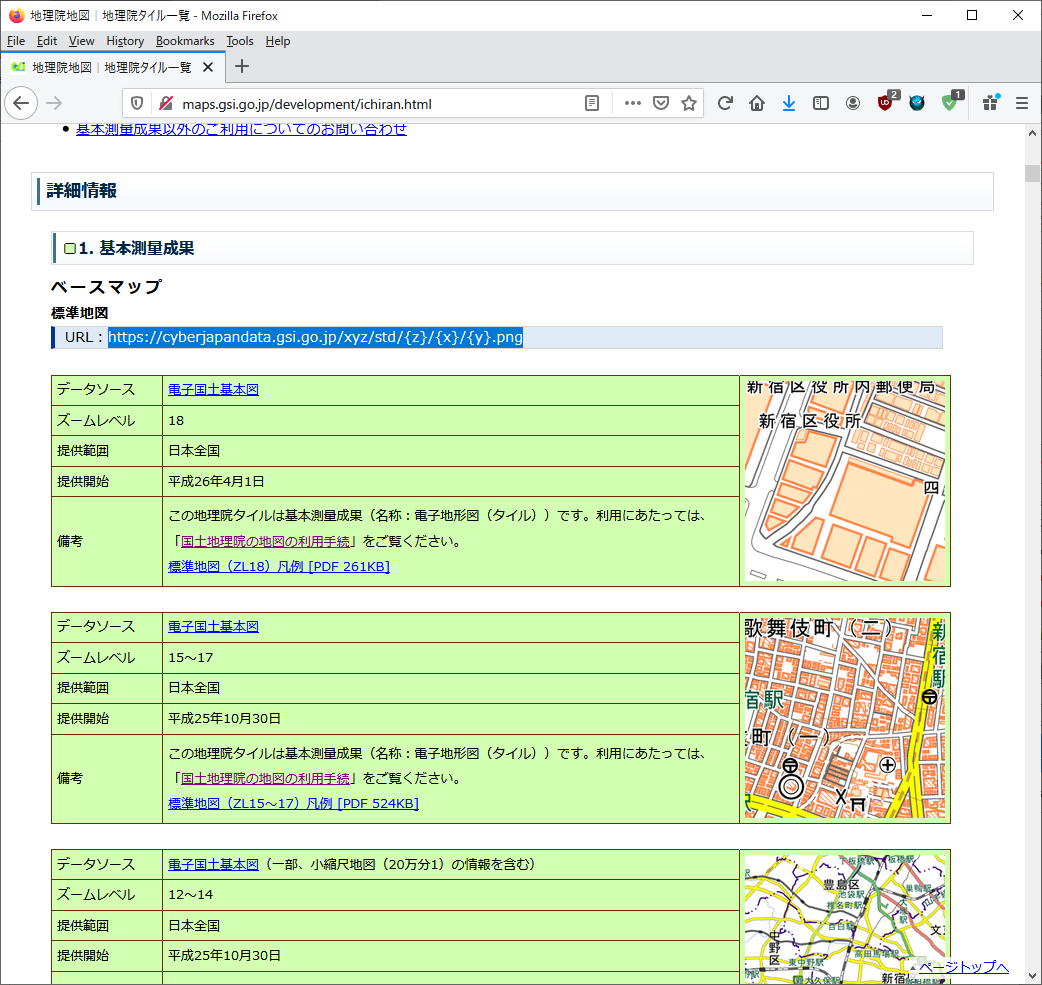 つぎに、地理院地図・地理院タイル一覧 ( https://maps.gsi.go.jp/development/ichiran.html ) にアクセスし、取得したい地理院地図の URL をコピーします。