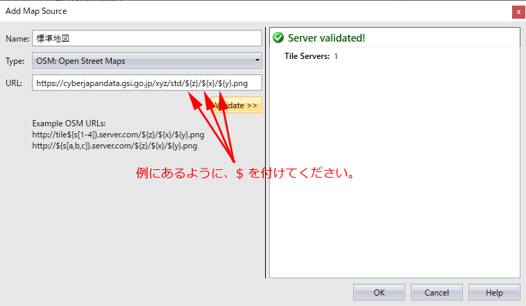 Add Map Source ダイアログに、URL をコピーしたら、Type に OSM: Open Street Maps を指定して、コピーした URL をペーストしてください。このとき、{z},{x},{y} のところには、例にあるように先頭に $ を付けてください。 Validate をクリックして、エラーが出なければ OK です。