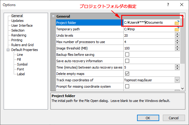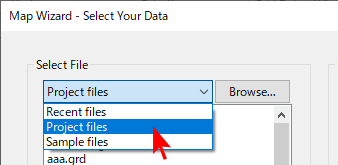もっとも簡単なのは、Wizard を使うことです。ご使用される作業フォルダの内容をここに表示させたい場合は、File → Options で表示される General セクションでプロジェクトフォルダのパスを指定すれば、Wizard の Project files ドロップダウンで開くことができます。お持ちのデータがプレビューで表示されますので、目的のデータを選択したら、次の画面で作成可能なマップタイプが選択肢として表示されます。