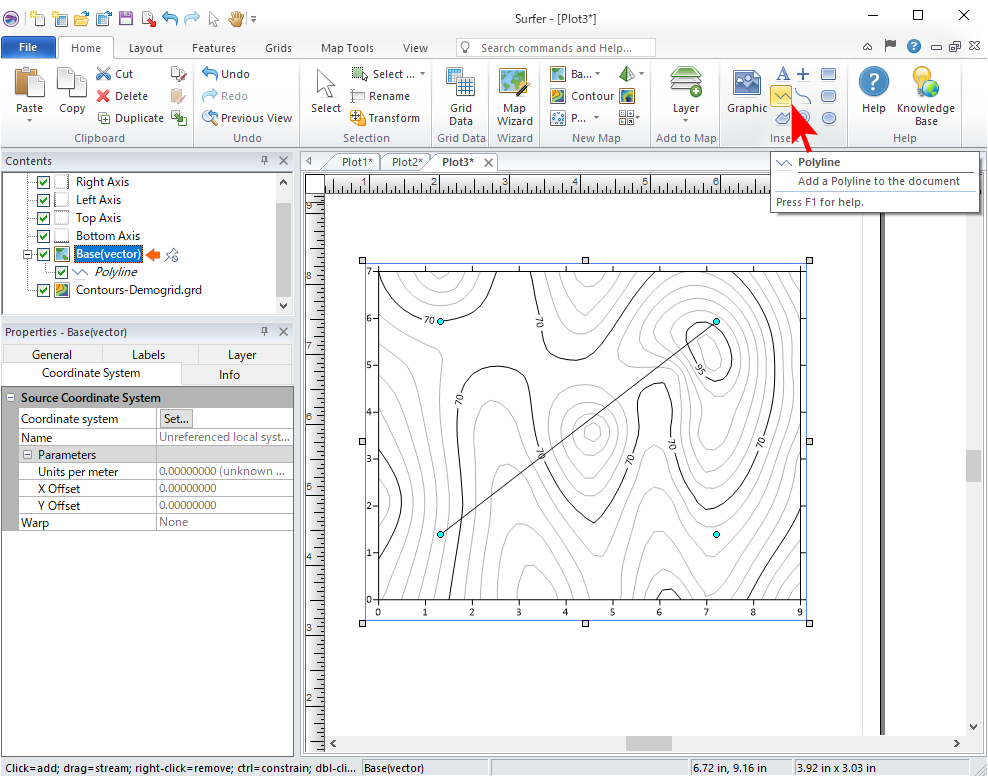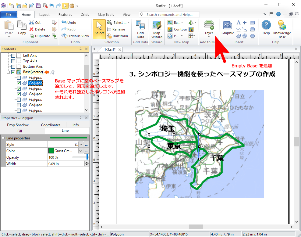 追加したベースマップ Base(vector) の中に図形を描画します。まず、Contents ウィンドウの Base(vector) レイヤーを選択します。Home タブの例えば Polyline をクリックすると図のようにラインを描画できます。描画したラインは、Base(vector) レイヤー内に polyline として追加されます (※円形を追加すると、Ellipse として追加されます)。