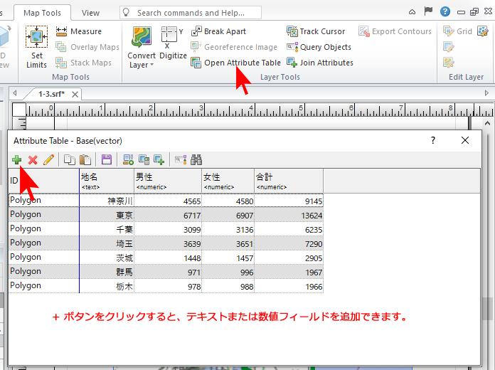 図形を描画した Base(vector) レイヤーを右クリックして、Open Attribute Table を選択します(または、Map Tools タブの Open Attribute Table を選択します。)。