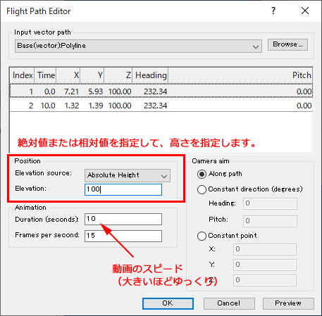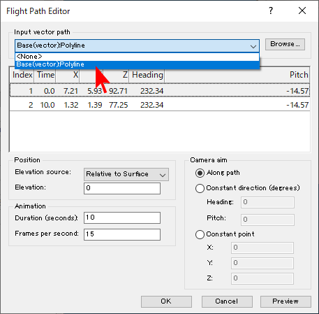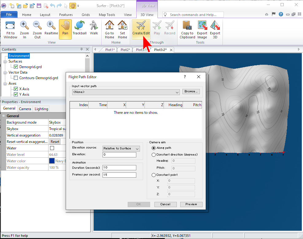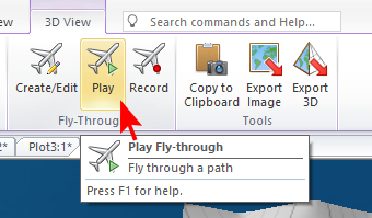 ラインやその他の図形を描画できたら、右クリックして 3D View を選択して、3D View 画面を表示してください。Fly-Through にある Create/Edit ボタンをクリックします。