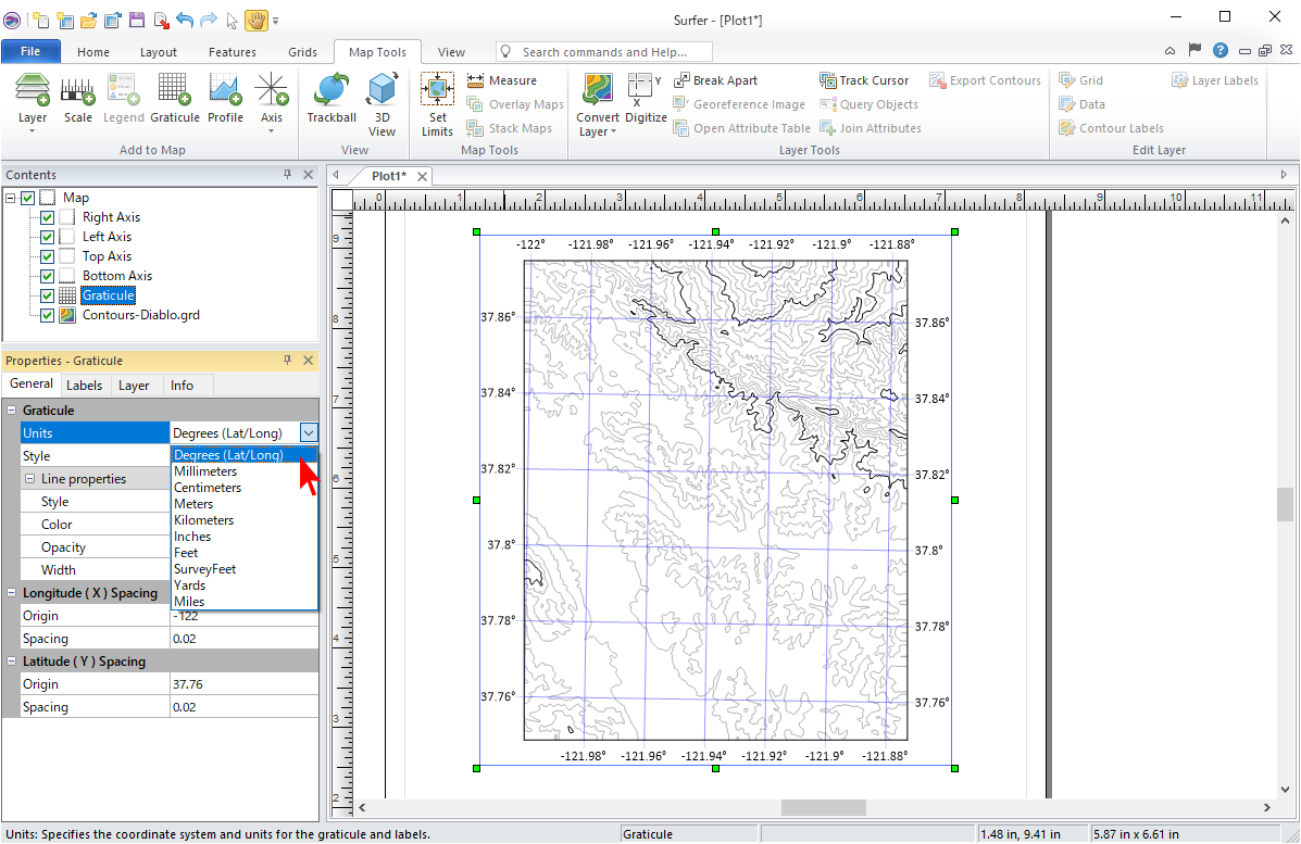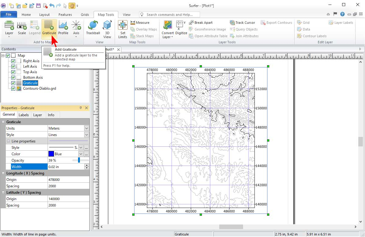 Map Tools の Graticule (経緯度線) 機能を使えば、等高線の外枠に緯度経度を付けることができます。