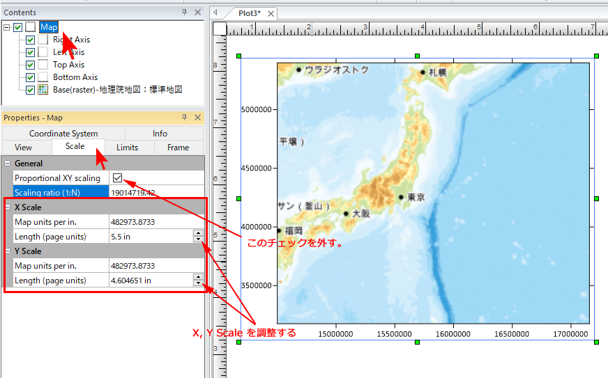 基本的には、読み込んだ Coordinate System のデータに間違いがなければ、表示されるとおりの比率になると思います。もし、その縮尺を変更したい場合は、Map オブジェクトの Scale プロパティを変更することで、任意の比率に調整することができます。Proportional XY Scaling にチェックが入っていると、XY が等比で変更されますので、このチェックを外して、値を変更してみてください。
