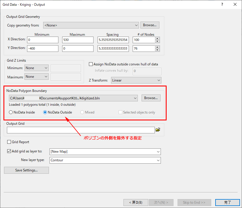 BLN ファイルで指定された範囲を考慮したグリッドファイルの生成は可能です。ただし、厳密にいえば内側だけを計算させる方法はありません。まずデータ範囲の全体の計算を定義したあと、BLN ファイルで指定された範囲の外側 (又は内側) を除外するという処理を経ることになります。なお、これらの処理は一連のウィザードで設定できますので、これにより内側だけの計算結果を得ることができます。