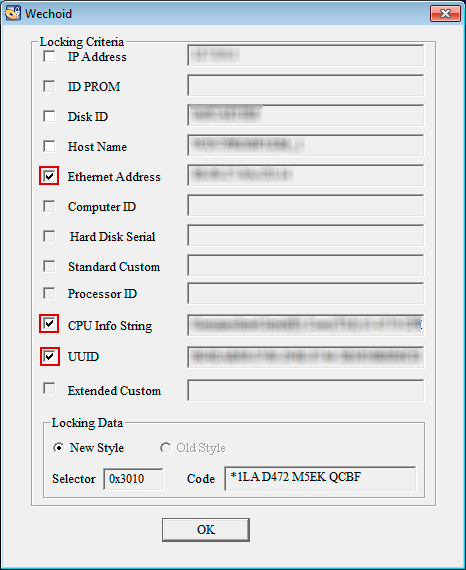- Wechoid ダイアログで、Ethernet Address, CPU Info String, UUID 以外のすべてのオプションのチェックを外します。