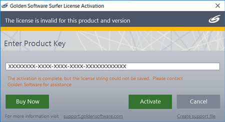 プロダクトキーに間違いは無いのに、エラーメッセージ “The activation is complete, but the license string could not be saved” が出てアクティベーションできません。